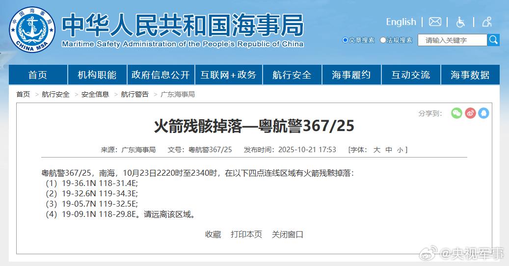 据中国海事局网站消息,广东海事局发布航行警告,10月23日22时20分至23时40分,南海部分水域有火箭残骸掉落广瑞网 ,请远离该区域。